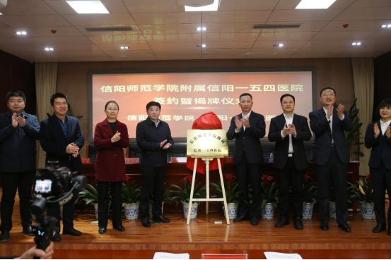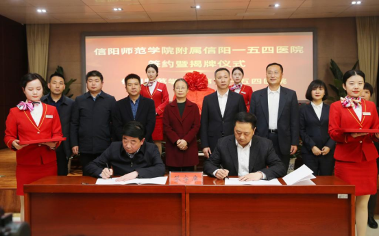 江玉安、吕宏迪分别代表双方单位签订了合作协议。江玉安、黄健共同为信阳师范公司附属信阳一五四医院揭牌。